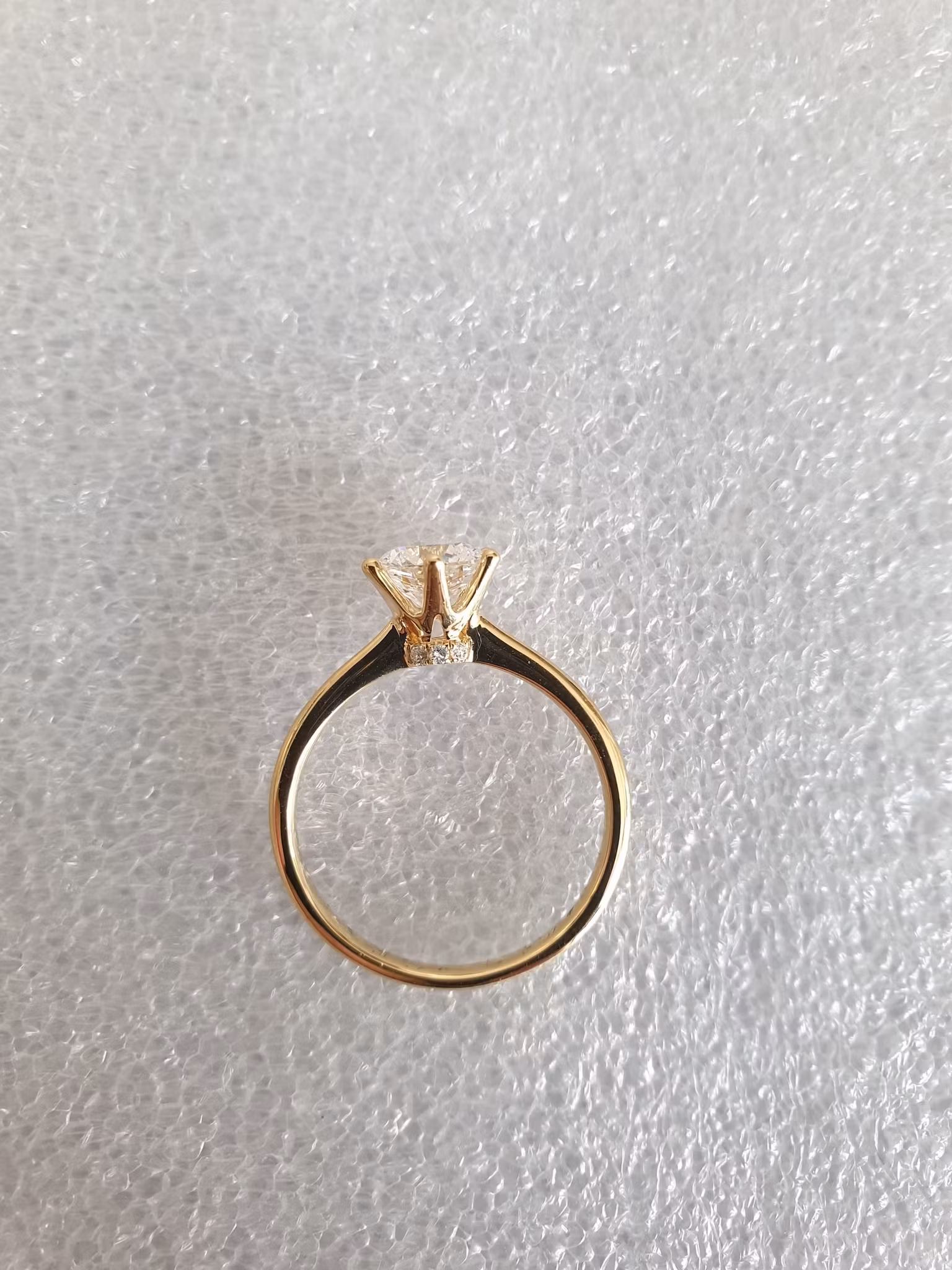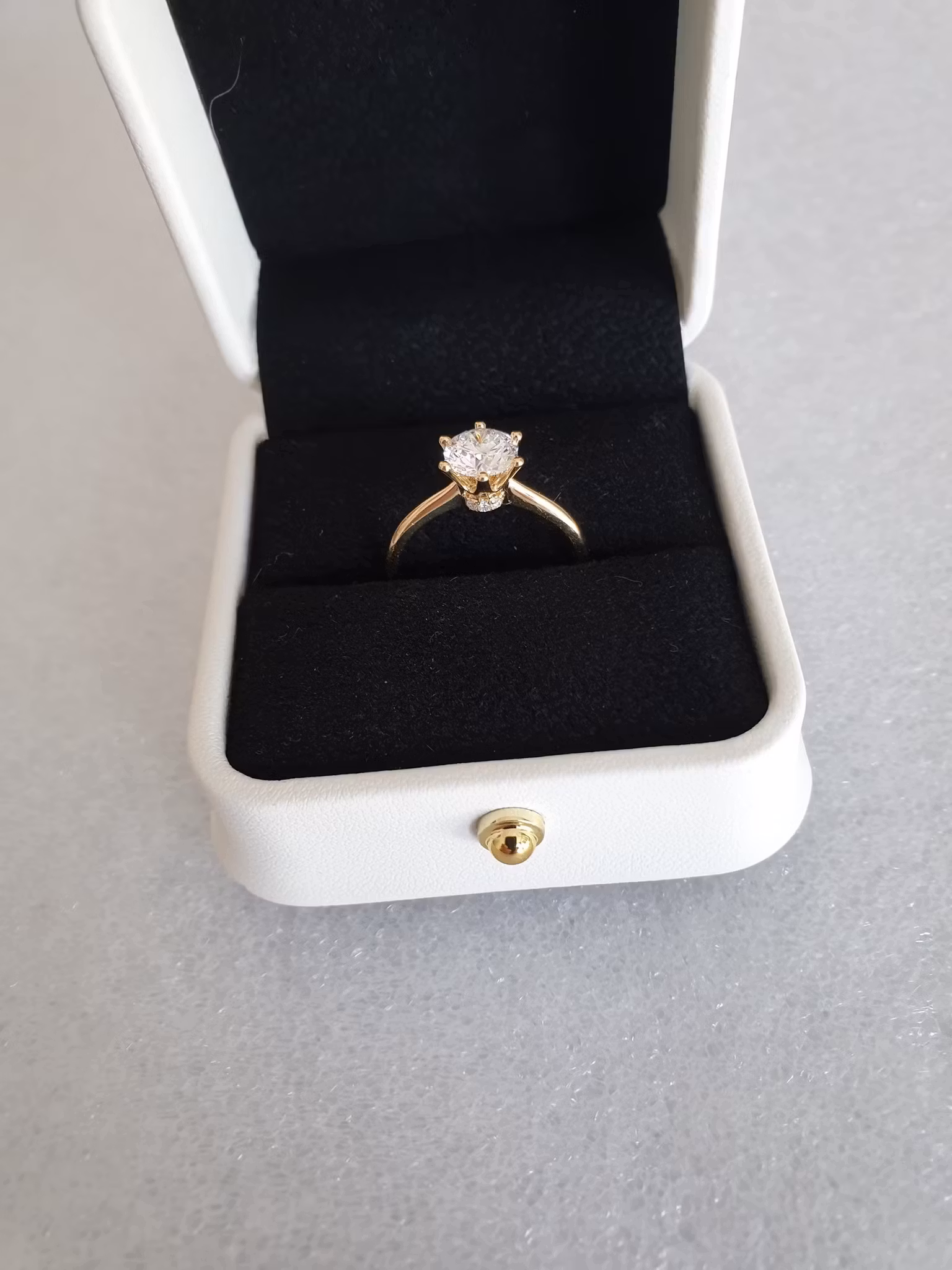 Flott lab-grown diamant-ring i 18K gult gull. Ringen er i str. 54 og veier 2,860 gram. Hoveddiamanten er 1,04ct og de små sidediamantene under kronen er 0,36ct - totalt 1,40ct. Dette er en ring i toppklasse og diamanten er gradert av Igi. Se det vedlagte sertifikatet som viser diamantens strålende graderinger. Det lønner seg å sette seg inn i diamantens graderinger da de er helt avgjørende for å bedømme kvalitet og verdi. Butikkpriser med graderinger og kvalitet som denne ringen ligger rundt kr. 50.000,-