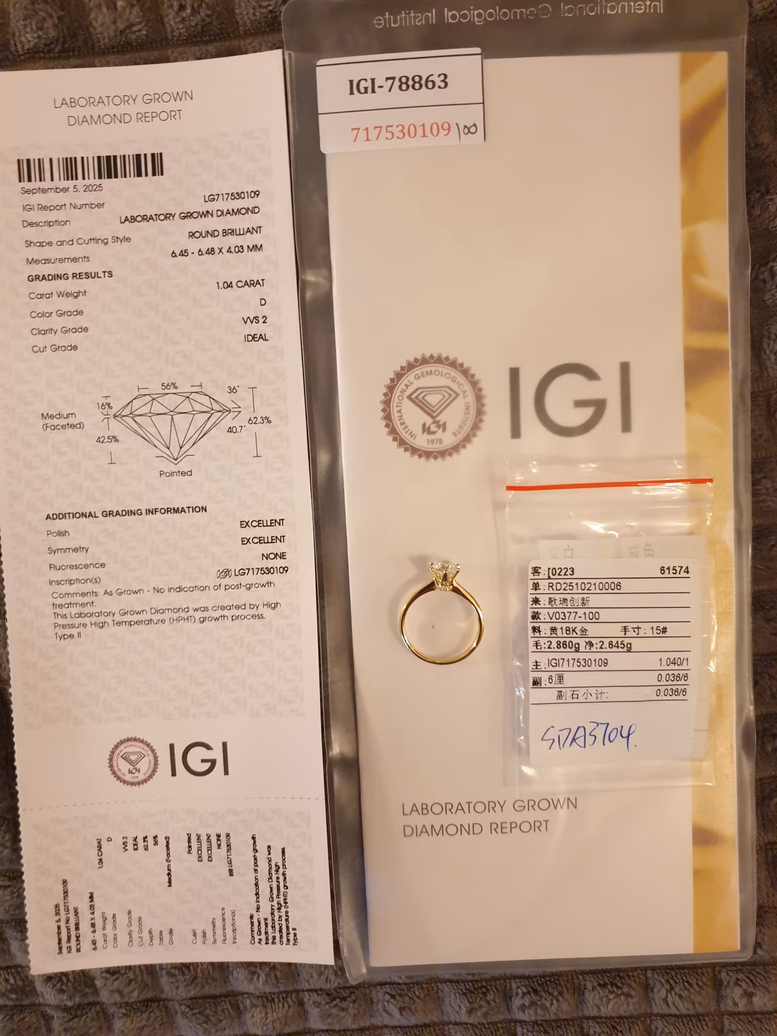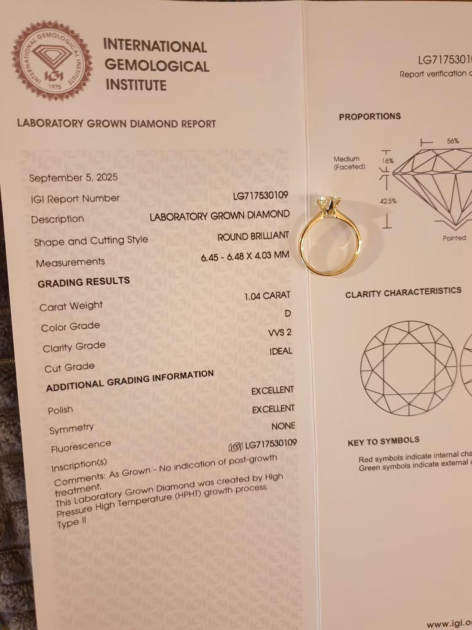 Diamanten. Igi report number LG717530109 (Kan verifiseres på www.igi.org)