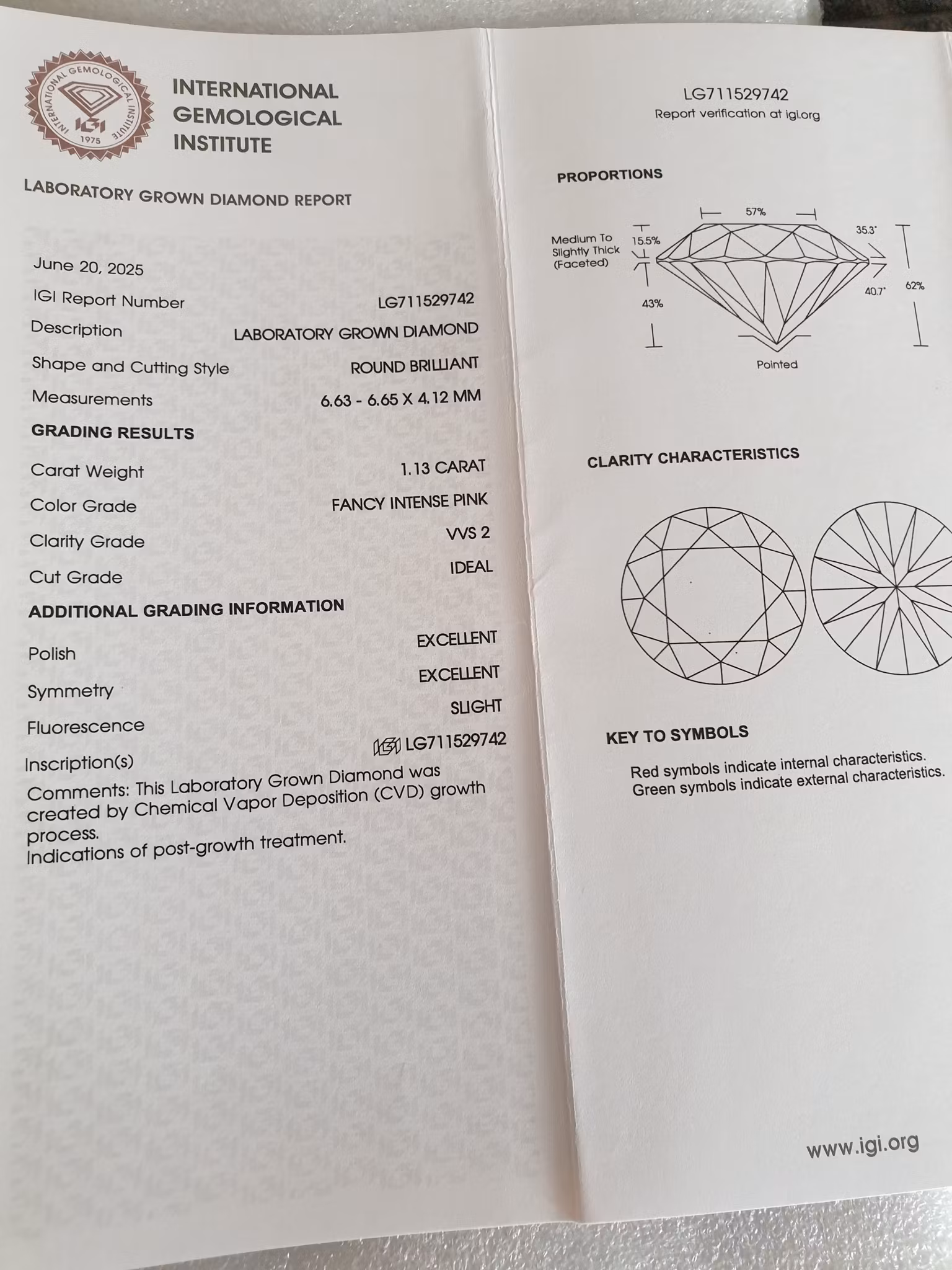 Fancy Intense Pink diamant (lab grown) 1,13ct. Fancy Intense Pink er en farge med god metning. Diamanten er lab-grown av meget høy kvalitet, du kan se de flotte graderingene fra Igi på den vedlagte rapporten. Fancy color diamanter er vesentlig dyrere enn vanlige lab-grown diamanter. Dette er et meget godt tilbud.