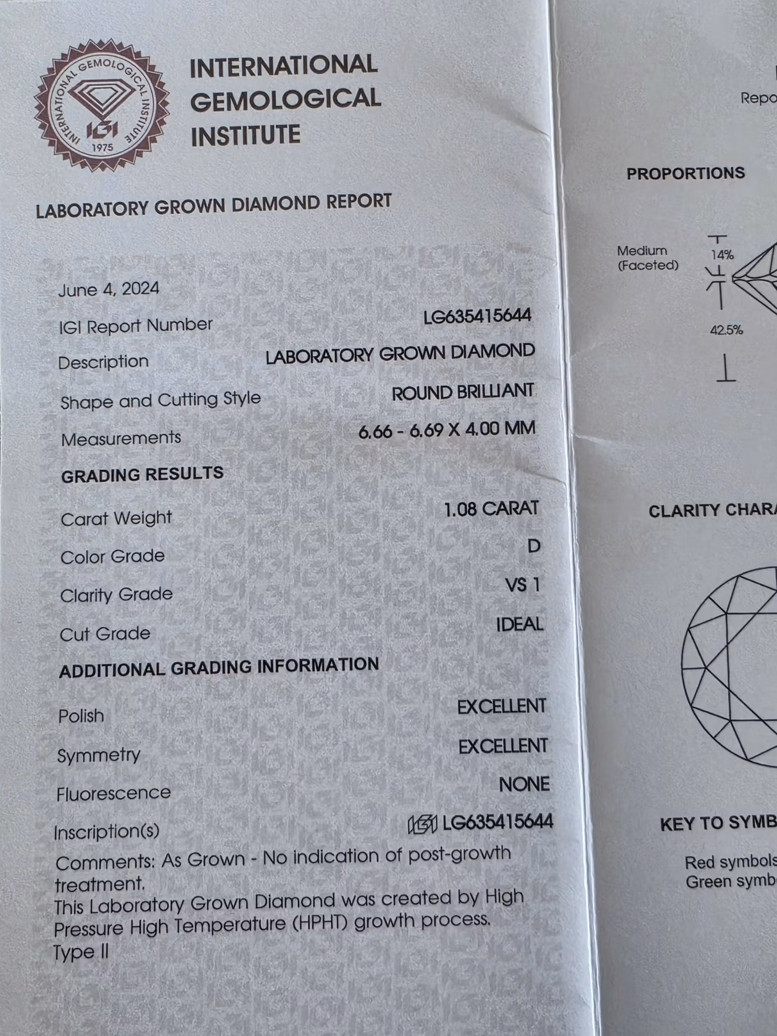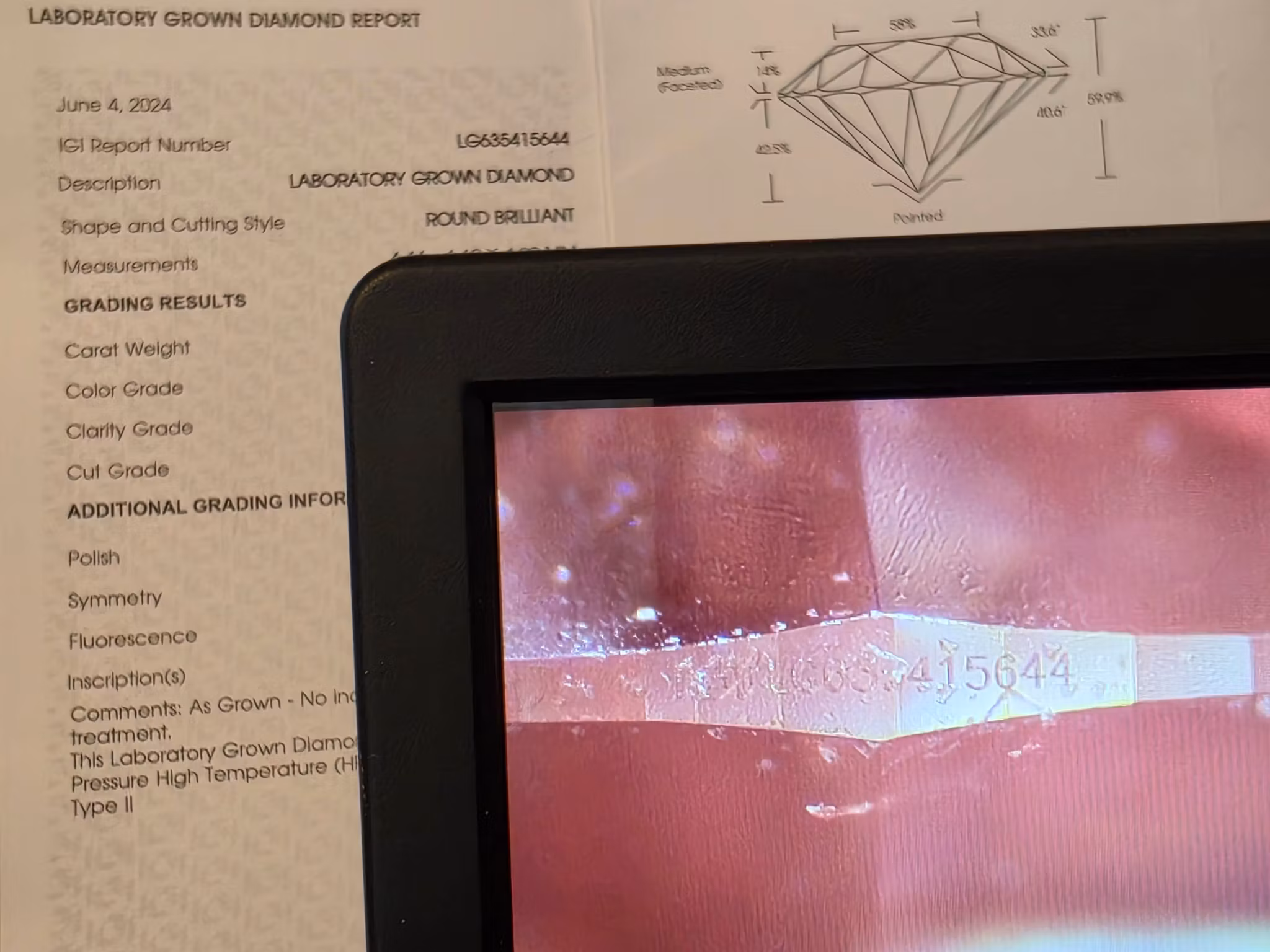 Inscriptions: LG 635415644 (Nummeret inne i diamanten stemmer med nummeret på sertifikatet. Se bildet vi har tatt med spesialmikroskop).
