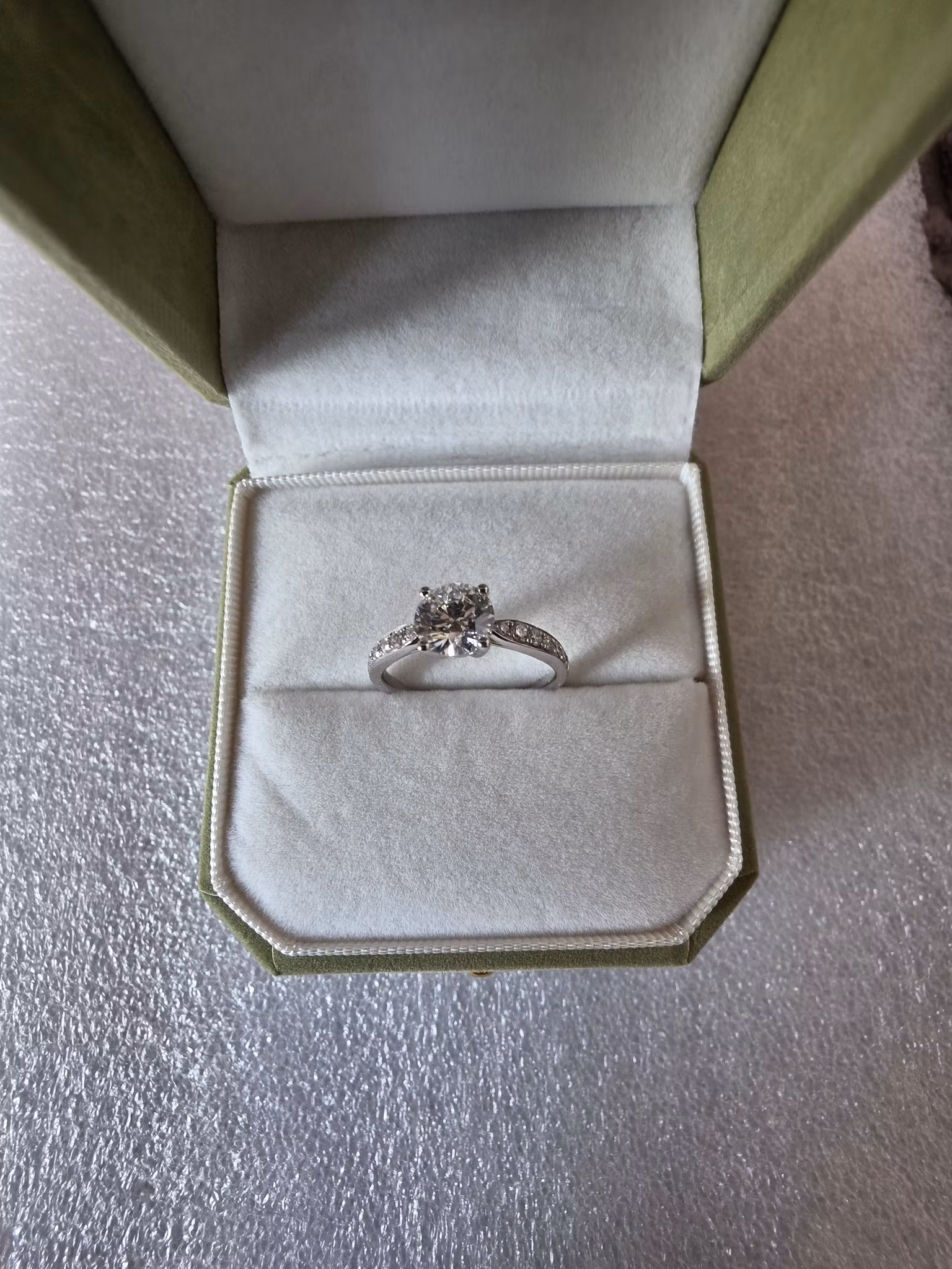Lab-grown diamant på 1,08ct og 14 små sidediamanter 0,26ct på ringskinnen, 7 på hver side. Totalt 1,34ct diamanter og vekt på ringen er 3,1 gram. Størrelse på ringen er 54. Diamanten er gradert av IGI (se sertifikatet) og har disse fremragende graderinger.