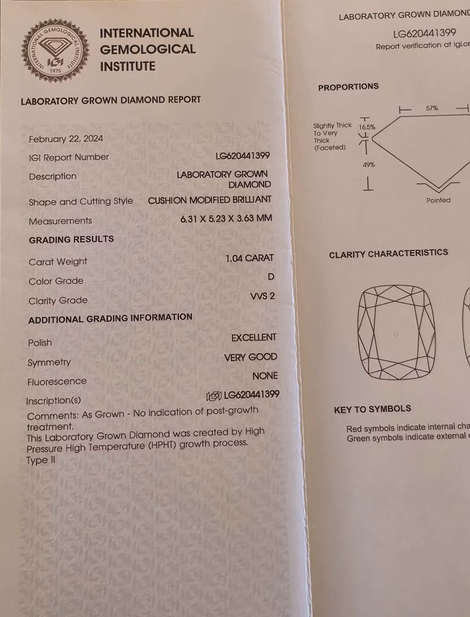 Eksklusiv Cushion Modified Brilliant 1,04ct. Diamanten er gradert av IGI som har utstedt det vedlagte sertifikatet med nummer LG620441399. Dette nummeret finner du også inne i diamanten, se vårt foto på bilde nr. 5 der vi har brukt vårt spesialmikroskop for å vise at dette nummeret samsvarer med nummeret på sertifikatet. IGI har gjort de superfine graderinger som du ser på sertifikatet: