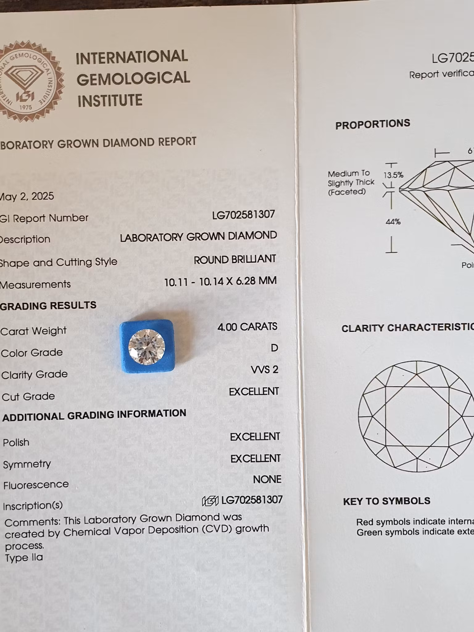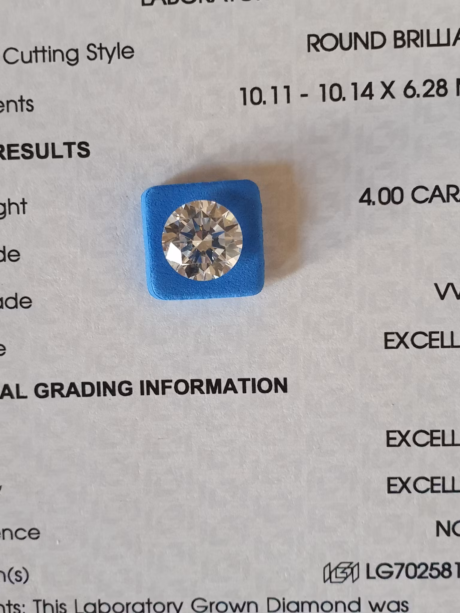 Denne diamanten er på hele 4,00ct og har de beste graderinger fra Igi. Det er viktig å sette seg inn i det som er beskrevet i sertifikatet for å forstå diamantens kvalitet og verdi. Det er farge D (D er den beste fargegraden, helt fargeløs). Det er topp klarhet og de andre graderinger er Excellent.